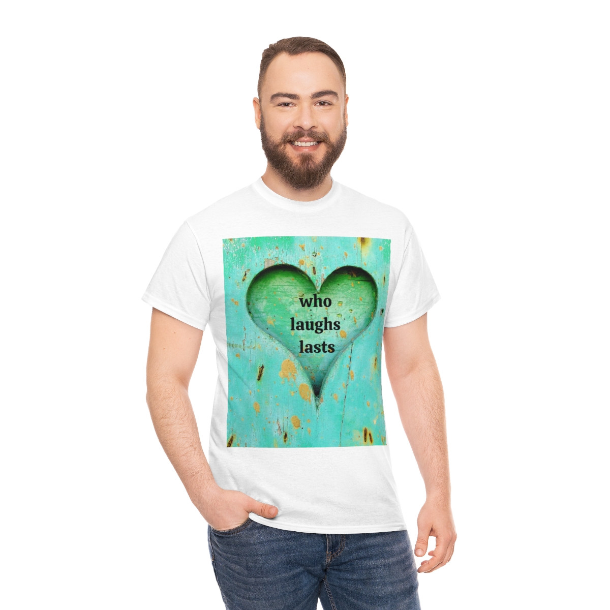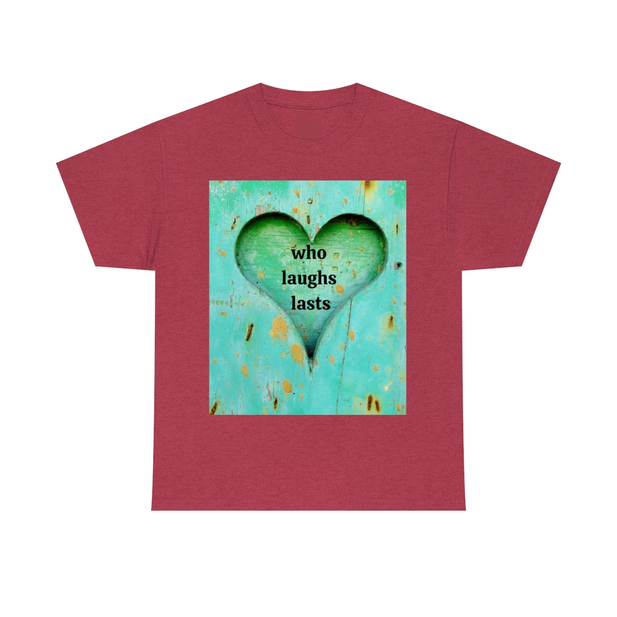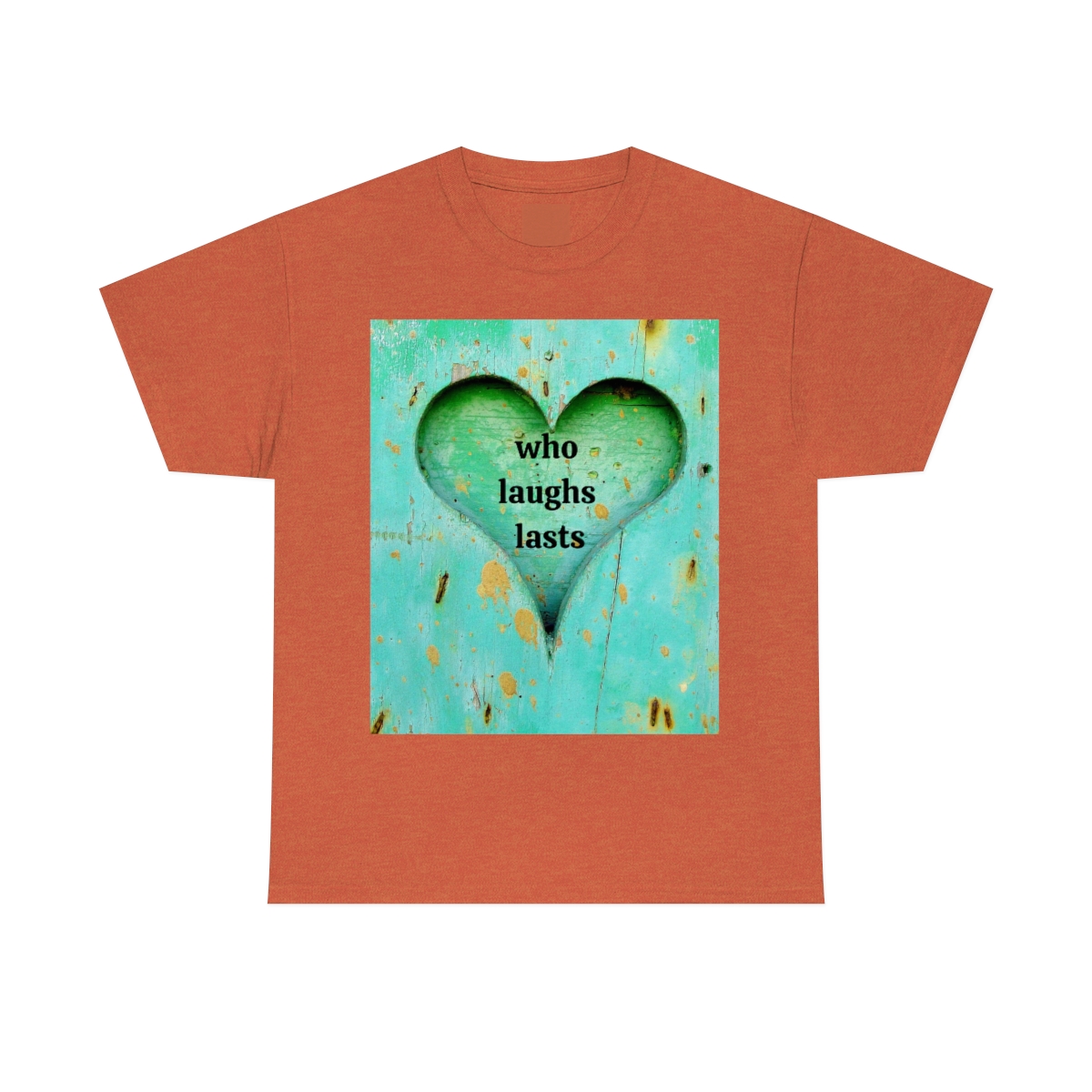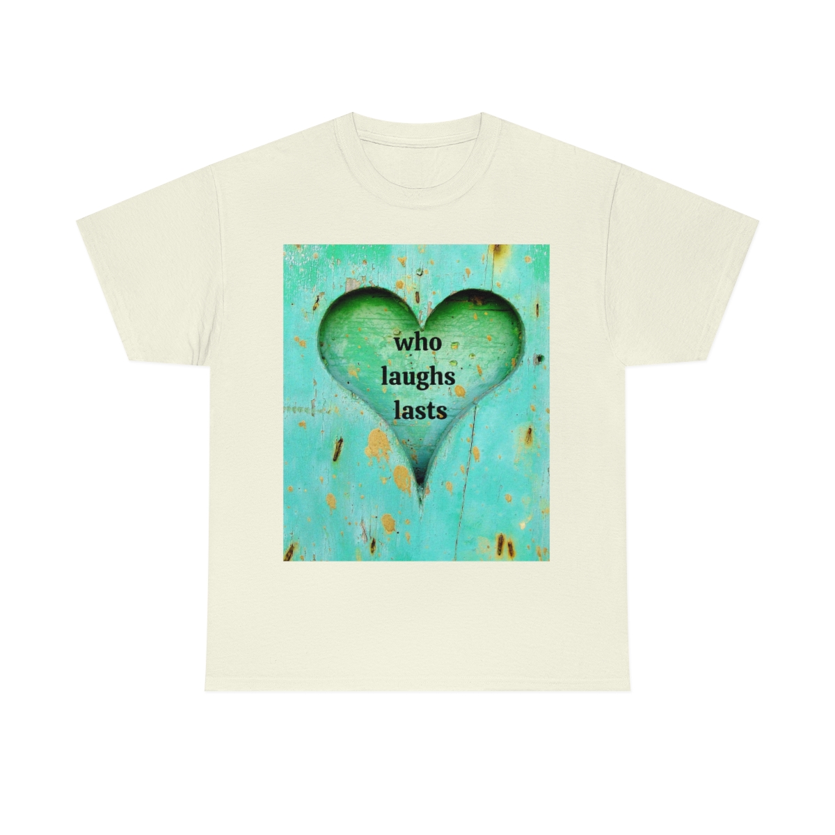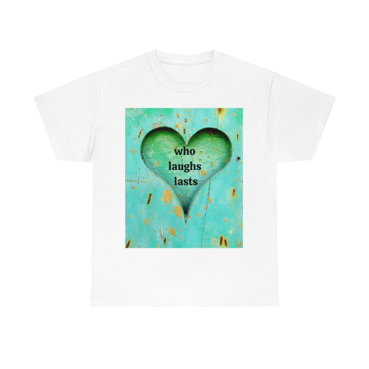 “who laughs lasts” unisex heavy cotton tee is the basic staple of any wardrobe. It is the foundation upon which casual fashion grows. No side seams mean there are no itchy interruptions under the arms. The shoulders have tape for improved durability.
