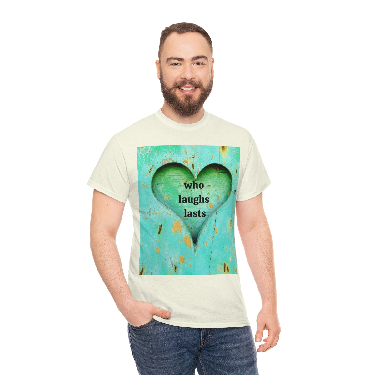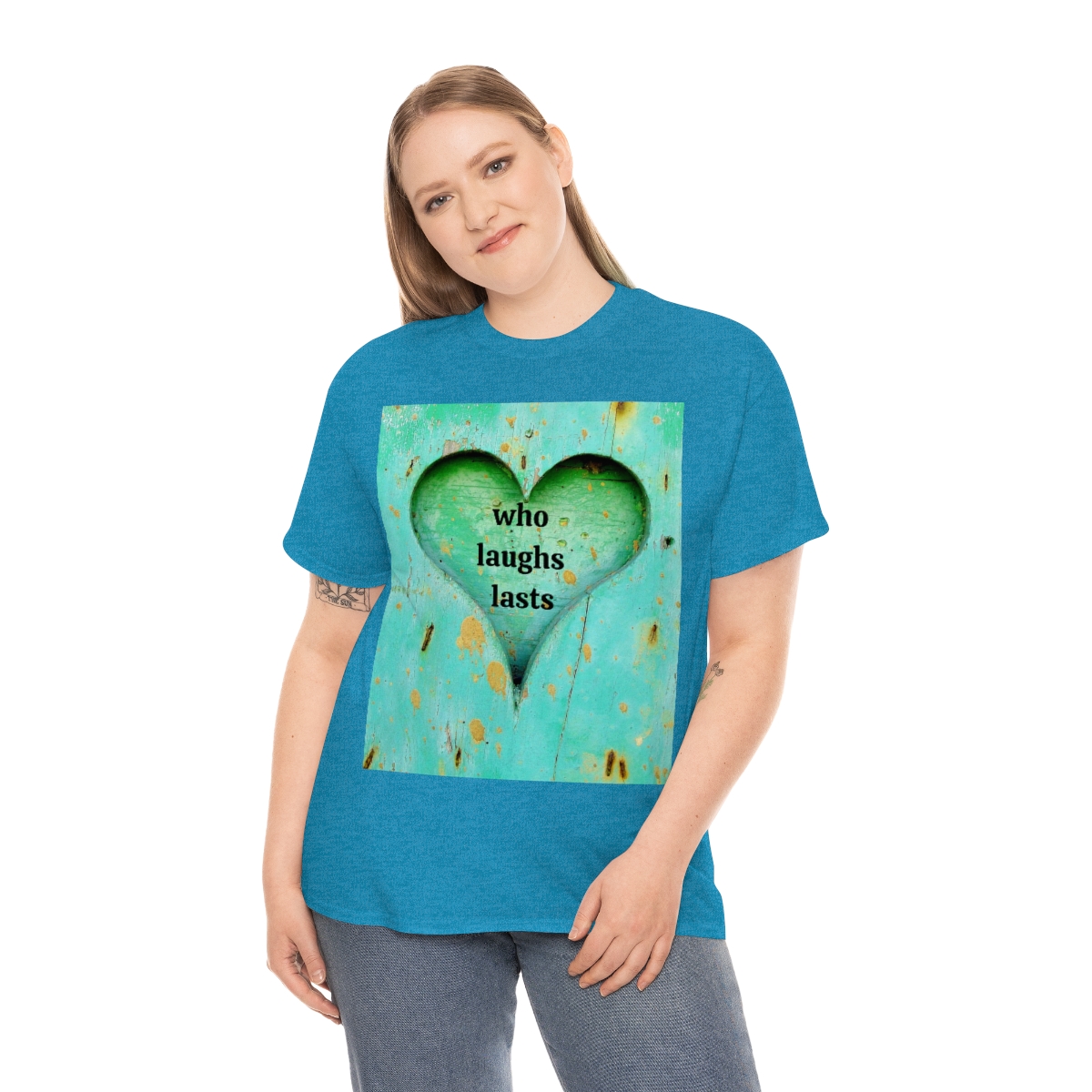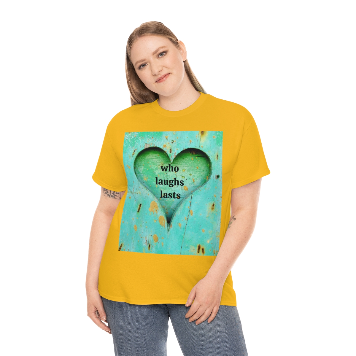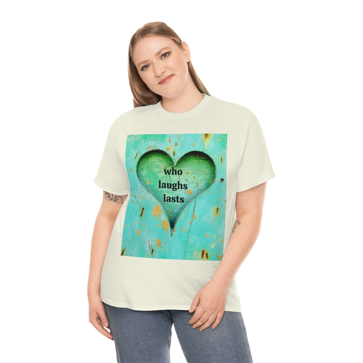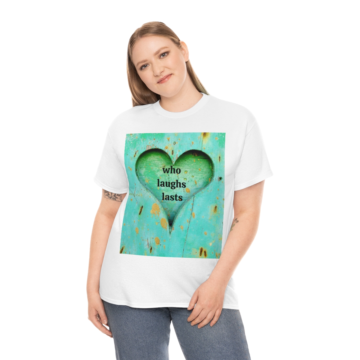 “who laughs lasts” unisex heavy cotton tee is the basic staple of any wardrobe. It is the foundation upon which casual fashion grows. No side seams mean there are no itchy interruptions under the arms. The shoulders have tape for improved durability.