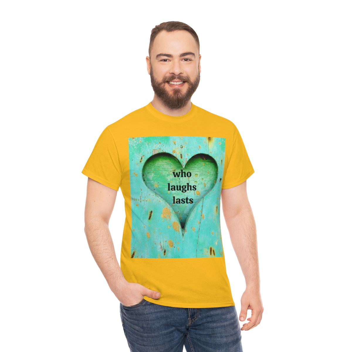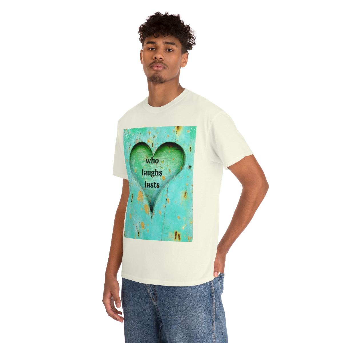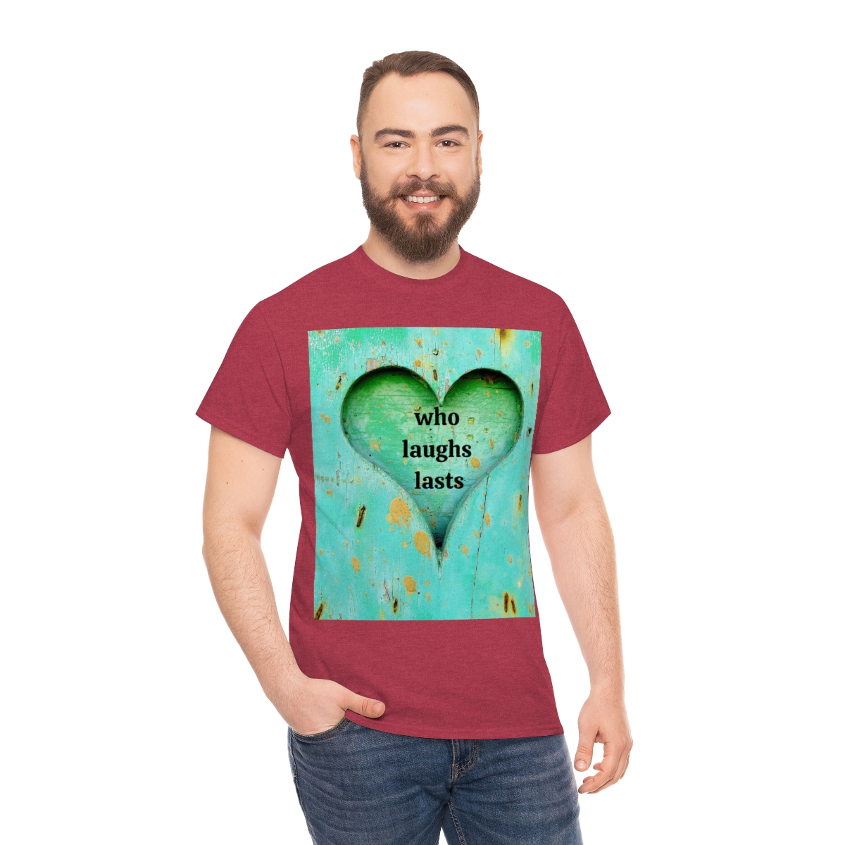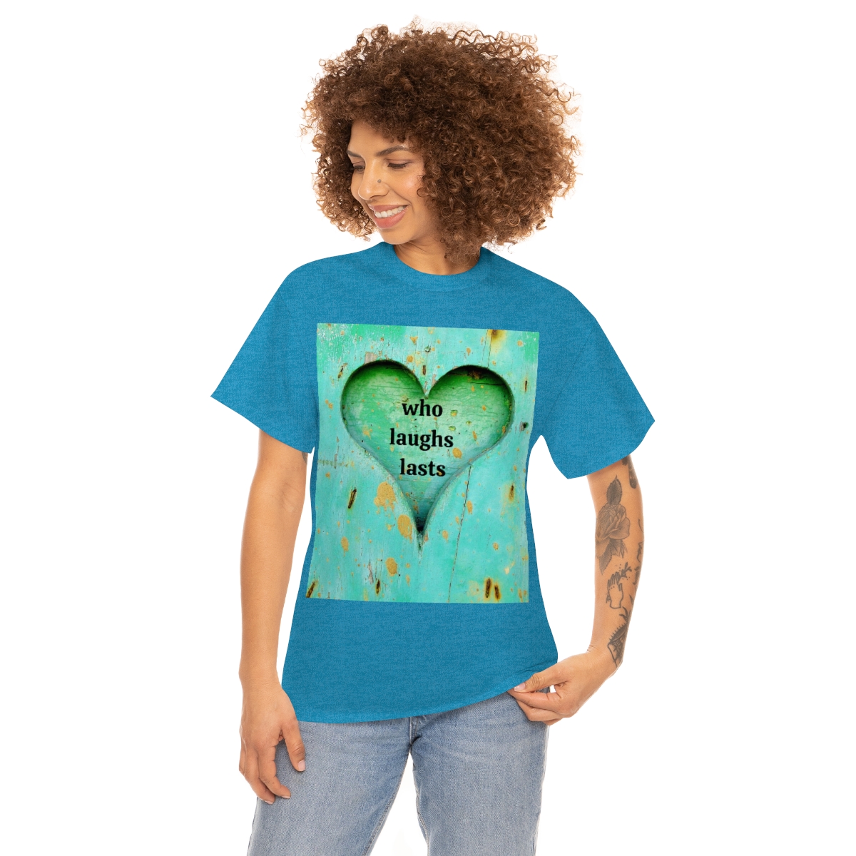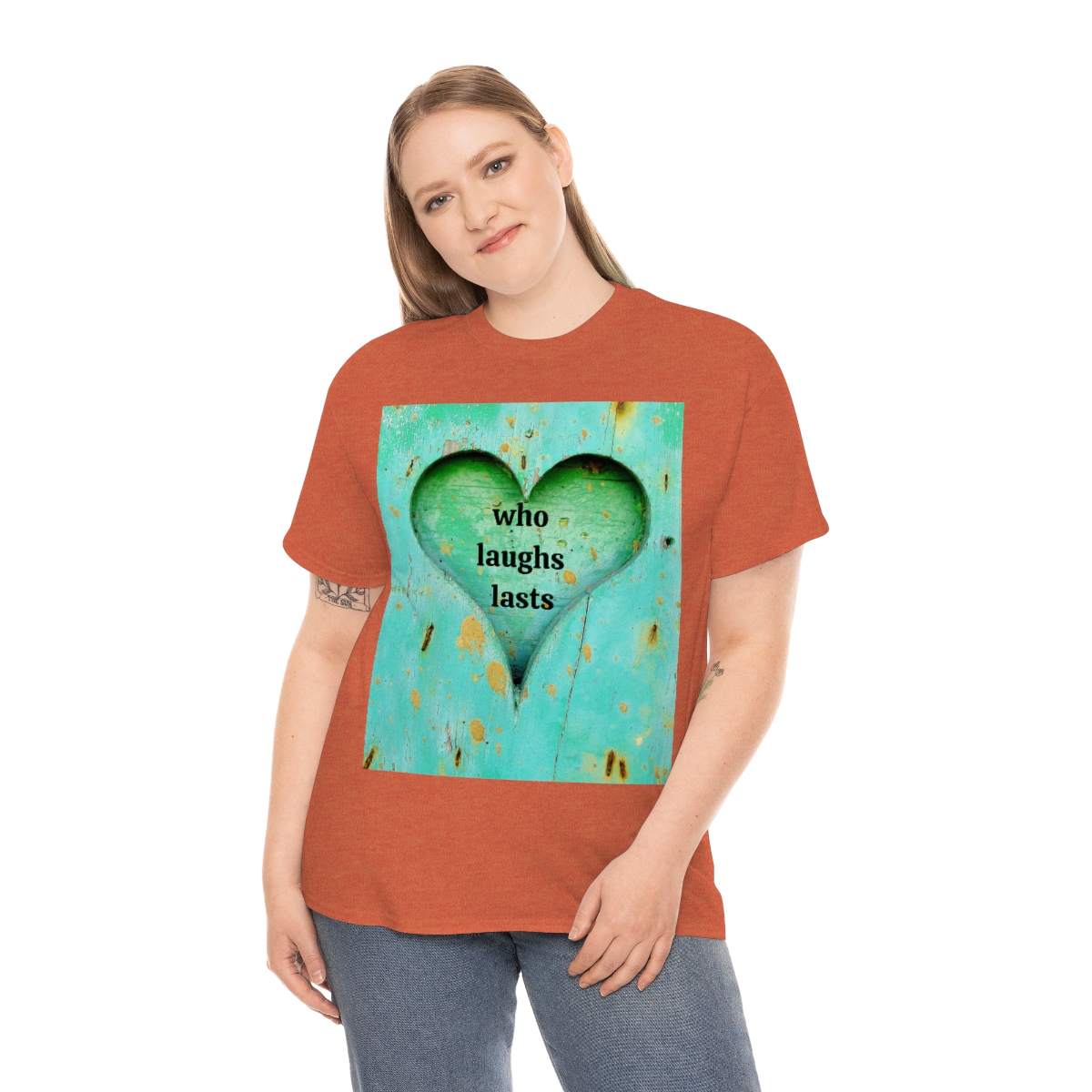“who laughs lasts” unisex heavy cotton tee is the basic staple of any wardrobe. It is the foundation upon which casual fashion grows. No side seams mean there are no itchy interruptions under the arms. The shoulders have tape for improved durability.