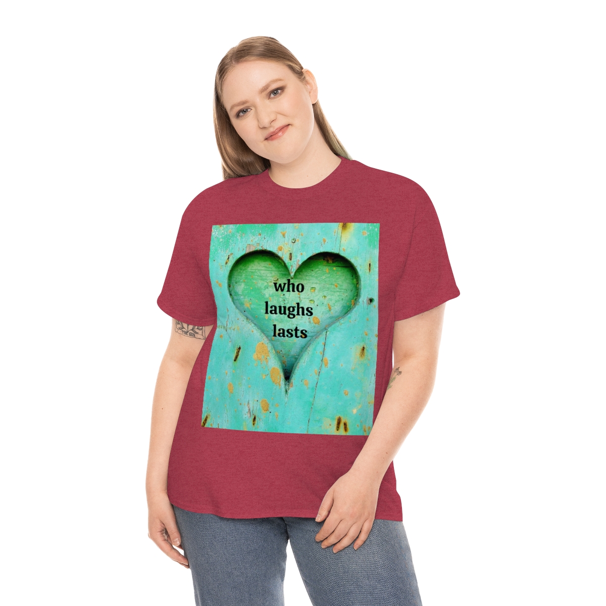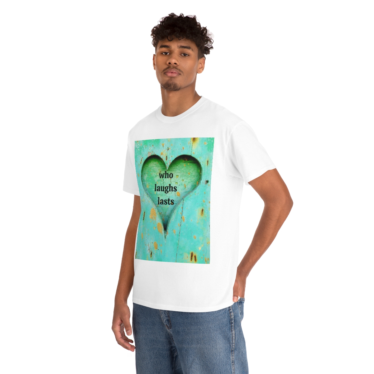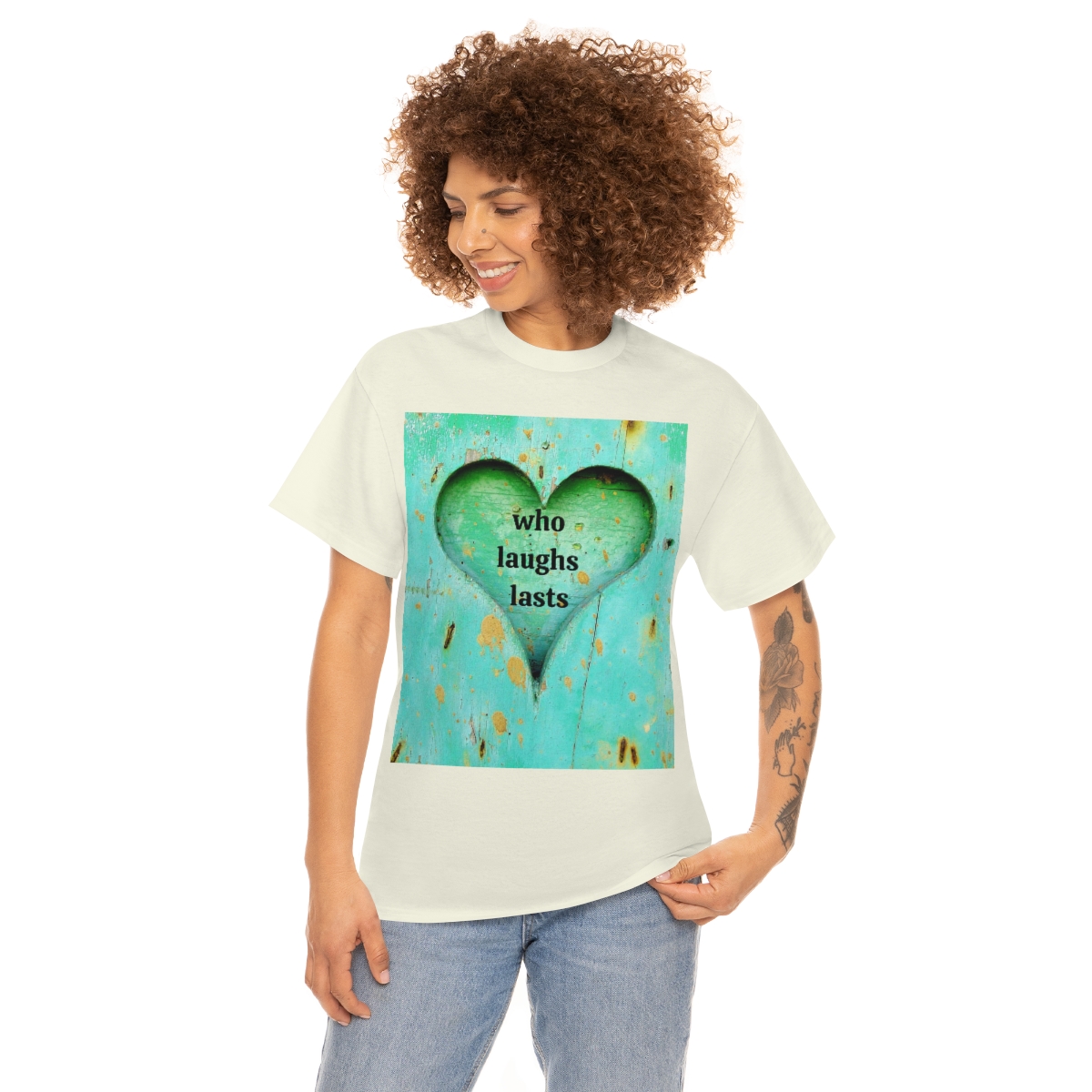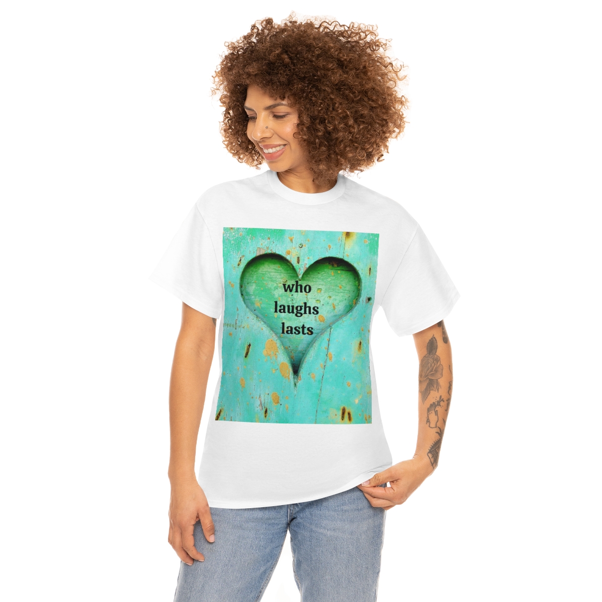 “who laughs lasts” unisex heavy cotton tee is the basic staple of any wardrobe. It is the foundation upon which casual fashion grows. No side seams mean there are no itchy interruptions under the arms. The shoulders have tape for improved durability.