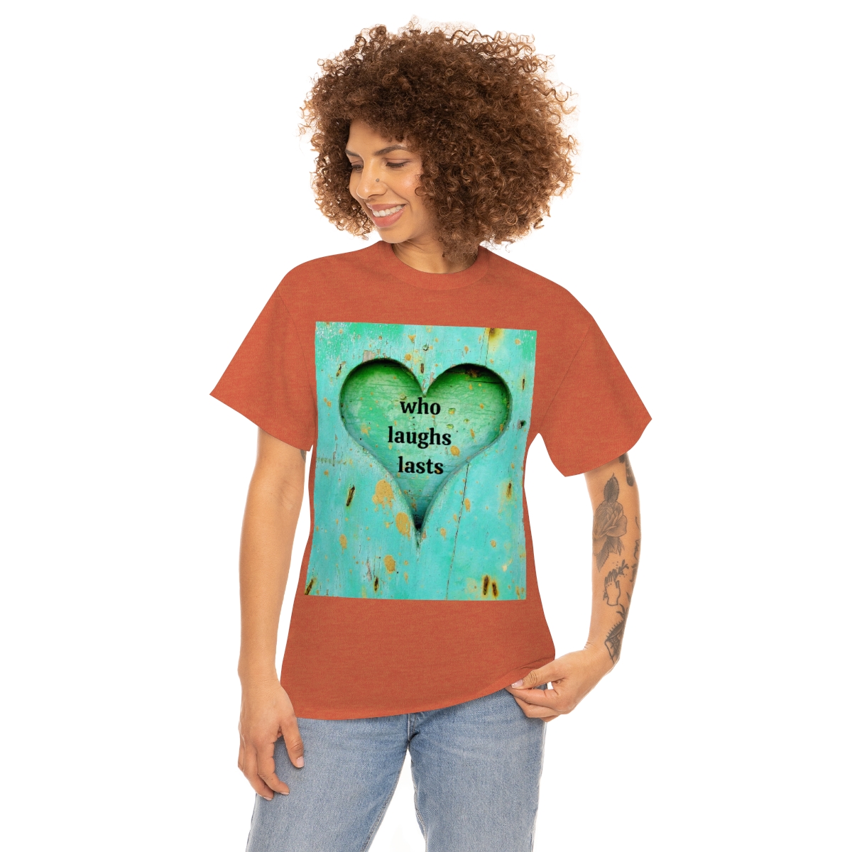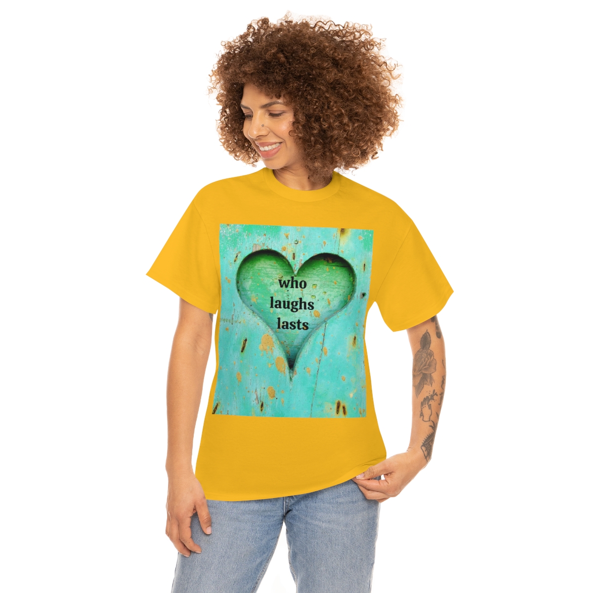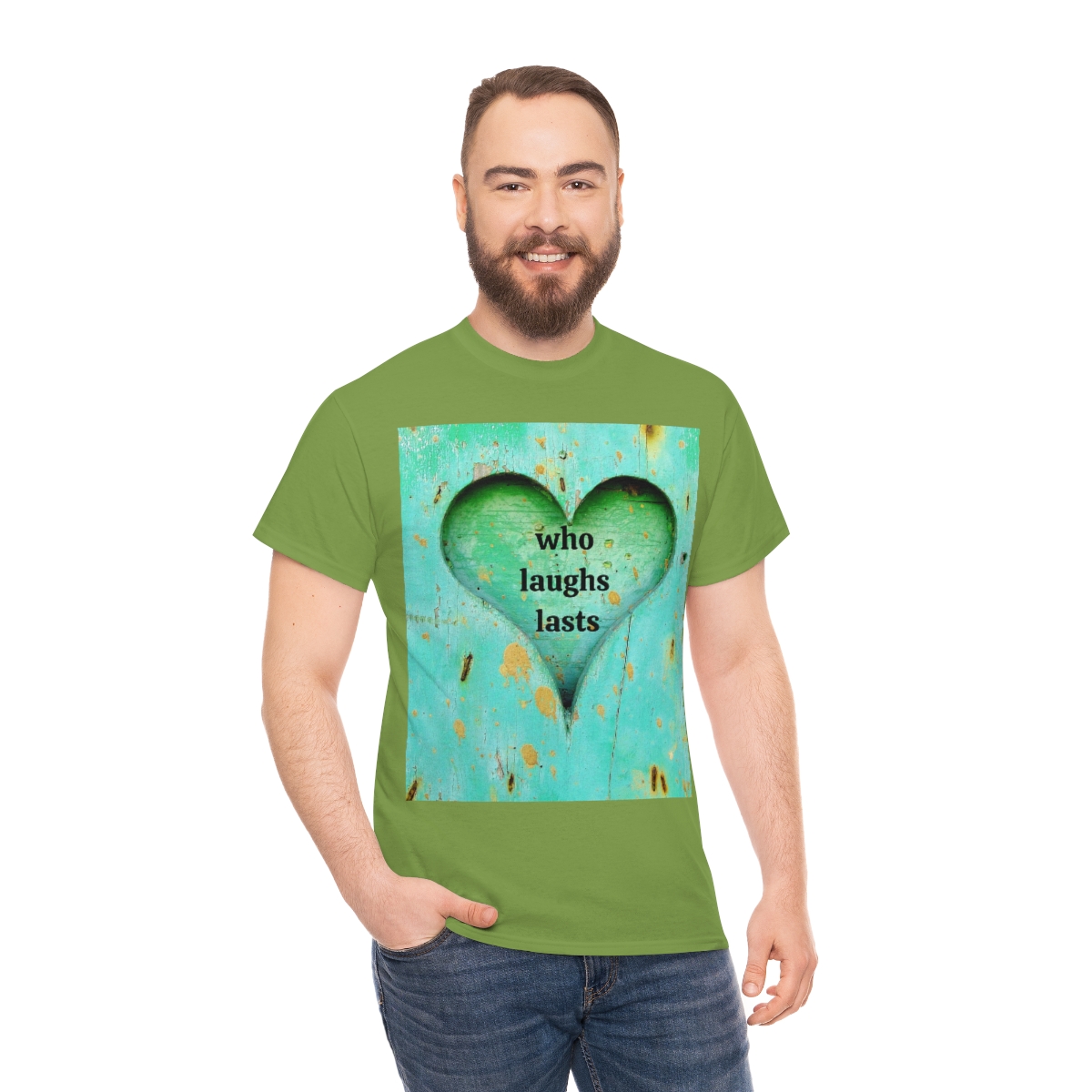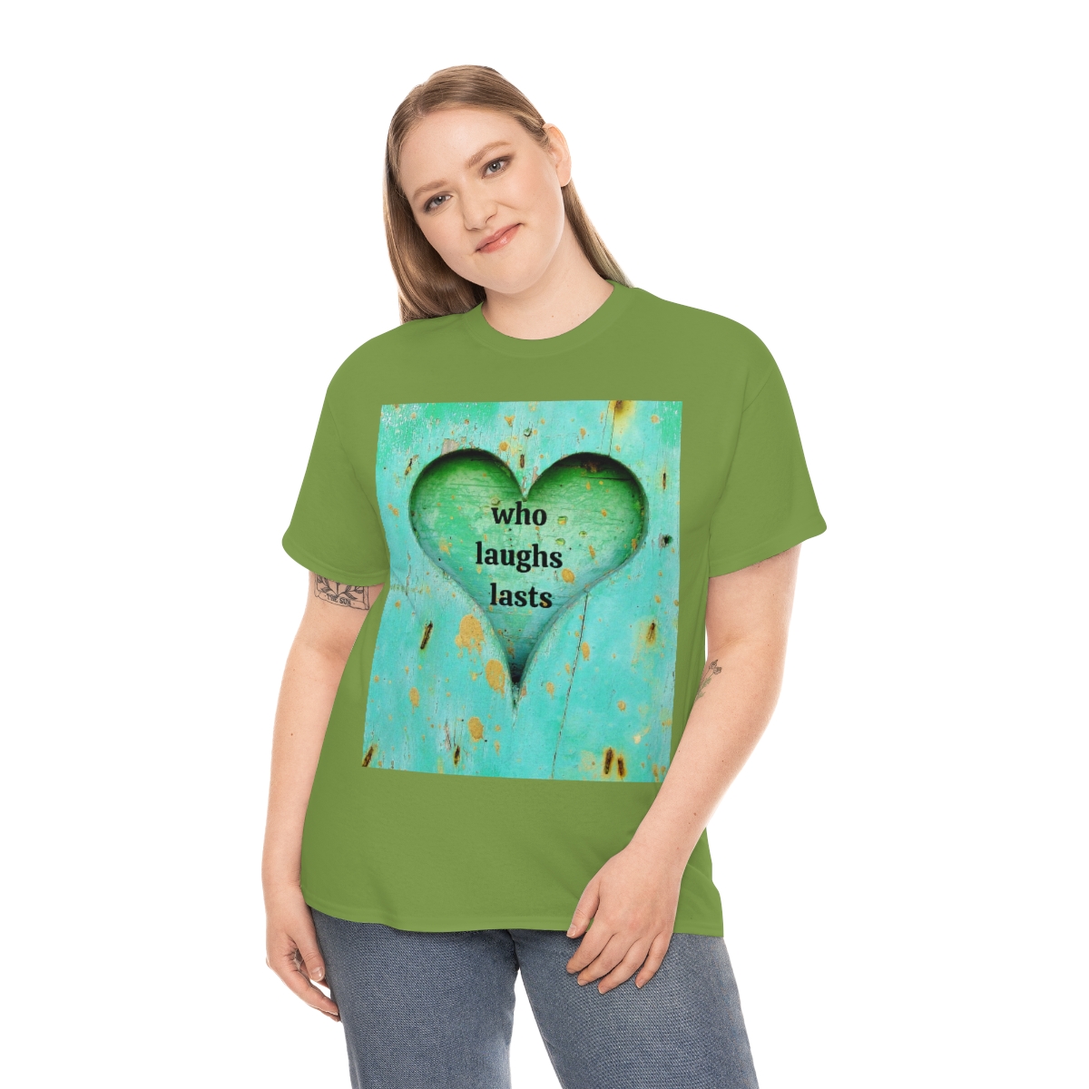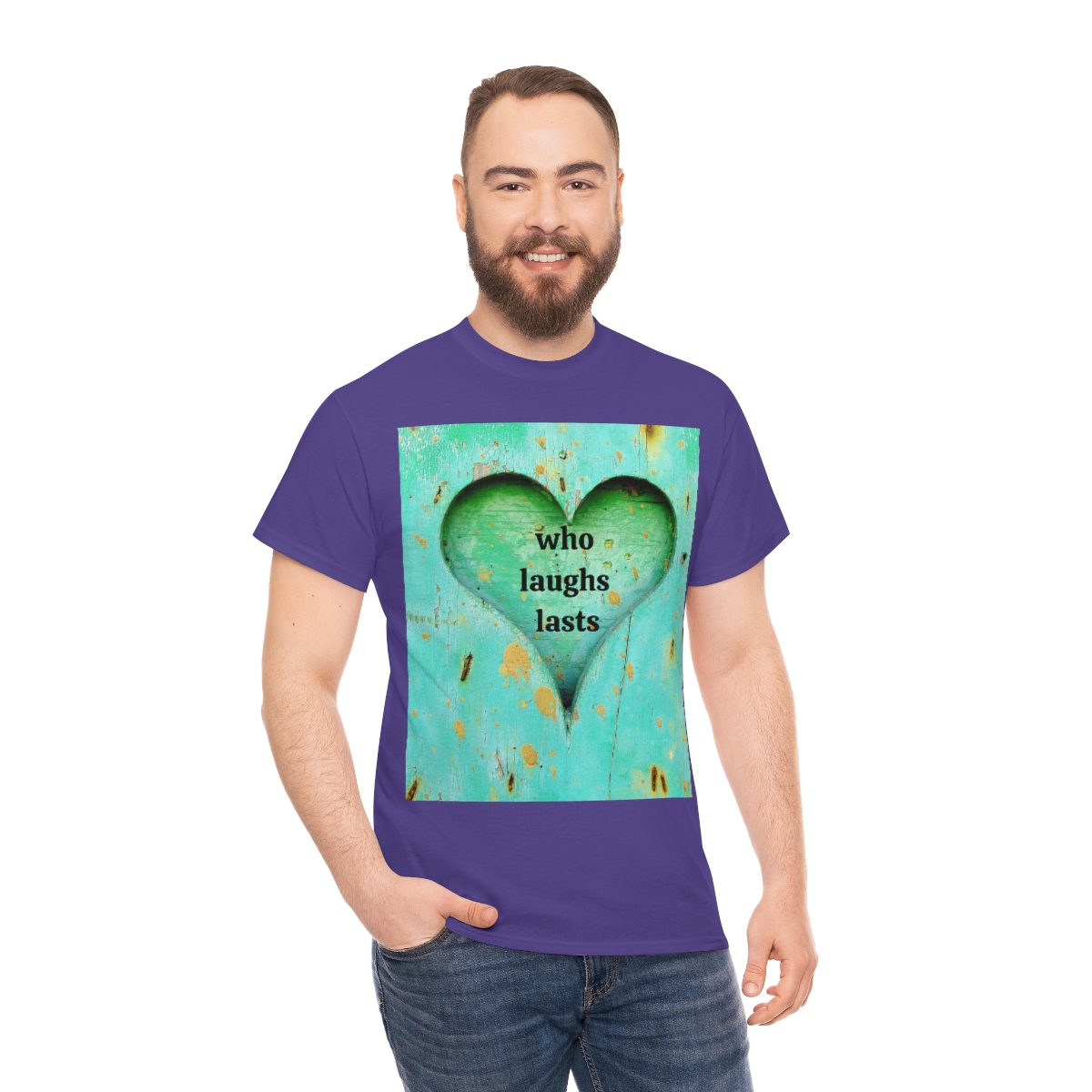 “who laughs lasts” unisex heavy cotton tee is the basic staple of any wardrobe. It is the foundation upon which casual fashion grows. No side seams mean there are no itchy interruptions under the arms. The shoulders have tape for improved durability.